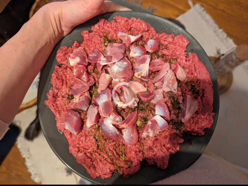 sowie mehrmals in der Woche frisches Fleisch, Innereien und auch Eintragsküken